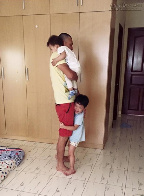 Diễn viên Đan Lê thích thú ghi lại khoảnh khắc ông xã vừa bế con út, vừa chơi với cậu cả.