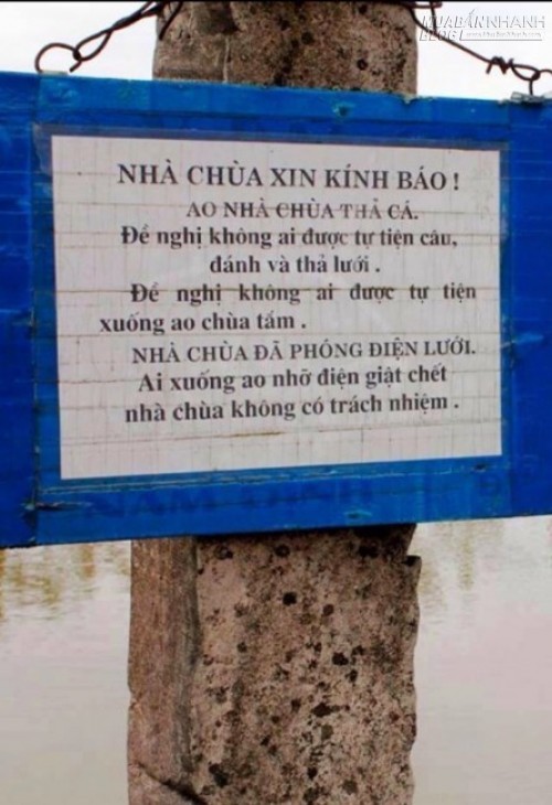 Tấm bảng thông báo của một ngôi chùa với nội dung "nhà chùa đã phóng điện lưới, ai xuống ao nhỡ điện giật chết, nhà chùa không có trách nhiệm" nhận được nhiều bình luận trái chiều. Ảnh: Duy Nguyen.