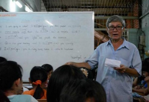 Lớp học tình thương của hai ông bà đã mở được 6 năm, tại địa chỉ 166 Phan Anh, phường Tân Thới Hoà, quận Tân Phú, TP HCM. Tất cả học sinh ở đây đều là các bé bán vé số, đánh giày hoặc lang thang không nhà cửa nhưng phải vẫn mưu sinh hàng ngày. Tối đến, các em lại tập trung về đây để nghe giảng, học chữ, và còn được dạy rất kỹ về đạo làm người. Buổi sáng, ông bà bán cơm chay để kiếm tiền mua sách vở, bút cho các em. Không chỉ vậy, ông bà còn cưu mang nhiều chó mèo đi lạc. Ảnh: Anh Thư.