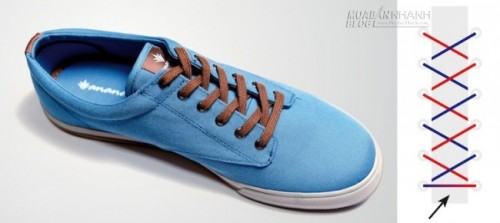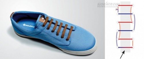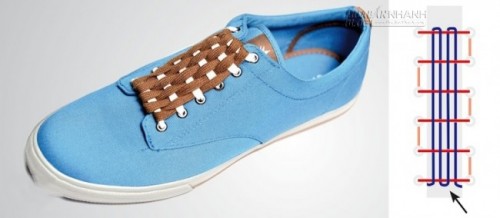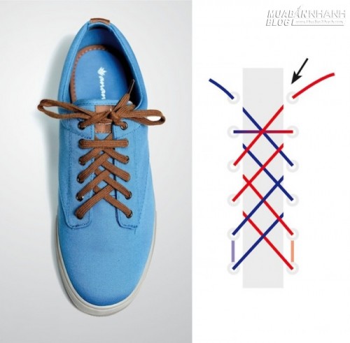 Kiểu thắt dây giày này bằng đầu bằng cách bạn xỏ dây từ trên xuống vào hai lỗ thứ nhất. Xỏ sợi dây bên phải (màu đỏ) từ dưới lên vào lỗ thứ 2 cùng dãy, xỏ ngang, xỏ chéo cách 1 lỗ từ dưới lên, 2 lần. Xỏ sợi màu xanh như hình. Thắt nơ.