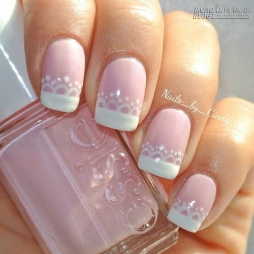 7. Bộ móng nền hồng với những nét vẽ màu trắng được điểm tô đầu móng, giống như những đường ren, đường voan trên váy rất đáng yêu phải không?