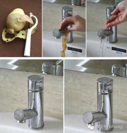 Dùng vỏ khoai tây đã được gọt (mặt có thịt) chà đi chà lại trên bề mặt vòi nước, sau đó dùng nước sạch rửa lại, vòi nước sẽ sạch sẽ như mới.