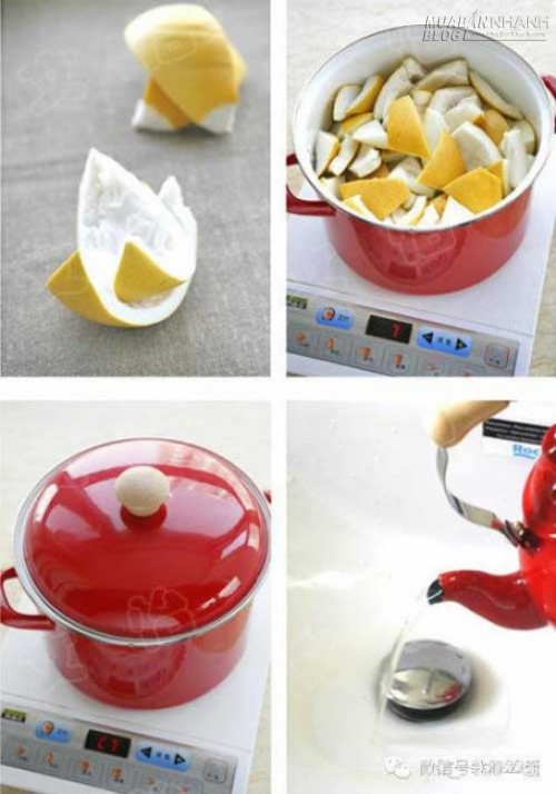 Vỏ bưởi thái lát, thêm nước, luộc sôi, đợi thêm 10 phút nữa. Nhân lúc nước còn nóng đổ xuống cống thoát nước. Mỗi tháng làm như vậy một lần sẽ có thể loại bỏ mùi hôi khó chịu và giữ đường ống nước sạch sẽ.