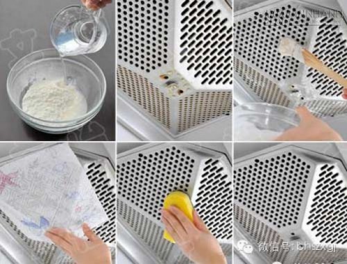 Đổ nước ấm vào trong bột mì, chú ý nước nên đổ từng chút một cho đến khi thành hỗn hợp sền sệt. Lấy bàn chải đánh răng hoặc cọ chấm vào hỗn hợp, sau đó chà trên tấm lưới của máy hút khói dầu. Tiếp đó lấy giấy dính lên trên bề mặt vừa quét để tránh nước nhỏ xuống. 5 phút sau bóc giấy ra, lấy miếng bọt biển rửa bát cọ lớp keo đi. Cuối cùng dùng khăn lau sạch đi là được.