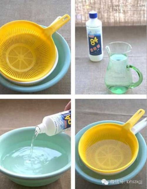 Đổ nước khử trùng và nước sạch, tỉ lệ 1/200 vào nhau. Ngâm đồ nhựa trong hỗn hợp nước trên 2 tiếng, sau đó dùng nước sạch rửa lại là được. Nước vừa ngâm đồ nhựa có thể đổ vào trong bồn cầu, ngâm 1 tiếng, còn có tác dụng làm sạch bồn cầu