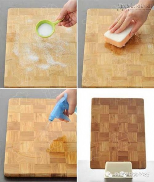 Đầu tiên rửa sạch thớt bằng nước và nước rửa bát, sau đó rắc một thìa muối lên trên thớt, lấy miếng rửa bát chấm ít nước, chà đi chà lại bề mặt thớt (khoảng 30 giây). Tiếp đó dùng nước lạnh xả lại, lại dùng giấm và nước với tỉ lệ 1:2 đổ vào trong bình phun, phun lên bề mặt thớt. Sau khi phun xong không nên dùng nước rửa nữa, để cho giấm lưu lại trên bề mặt thớt, đặt nơi thông thoáng cho tới khi khô.