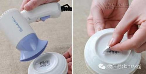 Dùng máy sấy sấy vào vị trí dán giấy, lớp giấy sẽ tách ra rất dễ dàng. Nếu như lớp giấy được dán quá chắc chắn, lấy miếng rửa bát thêm ít giấm, đặt lên trên tem nhãn hiệu khoảng 20 phút, sau đó lau đi lau lại trên vị trí đó cho đến khi lớp tem bong ra.