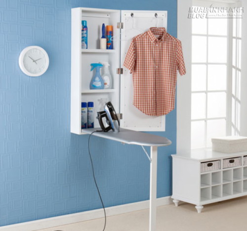 6. Tủ treo trên tường kết hợp gương. Khi cần sử dụng thì mở ra ủi đồ, đựng thêm một số chai lọ. Nhìn thật đẹp và hợp mắt