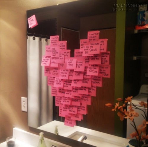 Đính một kỉ niệm ngọt ngào, một câu nói vui lên tấm gương trong phòng tắm, trên tủ bếp hoặc trên bàn làm việc của chàng trước khi đi làm buổi sáng. Đảm bảo anh ấy sẽ rất thích thú và khởi đầu ngày mới thật vui vẻ.