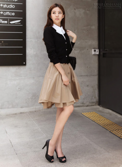 Nếu muốn tới công sở, bạn có thể thay chiếc quần short bằng váy midi và đôi giày cao gót. Bạn sẽ có một vẻ ngoài lịch sự và dịu dàng.