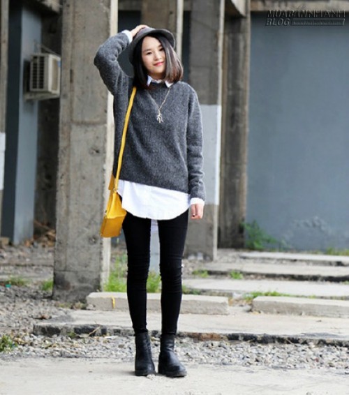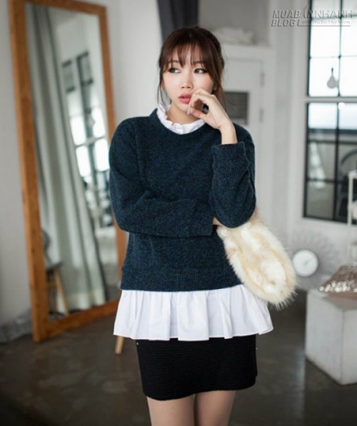 Ngoài cardigan thì các bạn gái có thể mặc sơ mi trắng bên trong áo sweater.