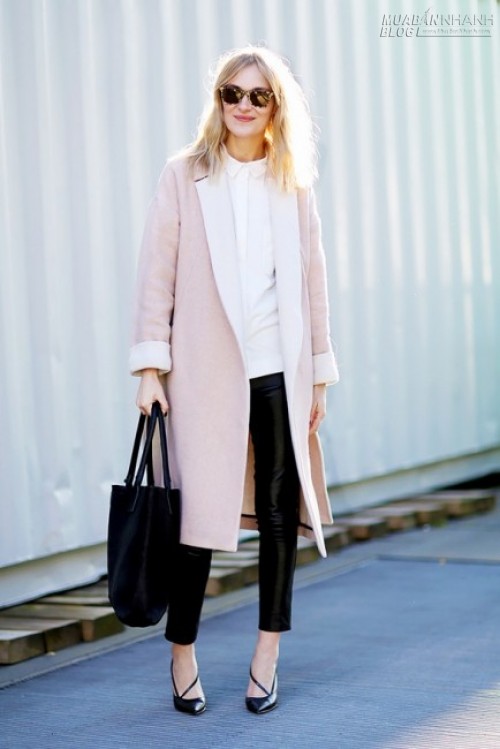 Khi tiết trời cuối thu trở lạnh hơn, việc mix áo sơ mi với chiếc áo khoác dài cùng quần da sẽ giúp bạn trở nên ấm áp mà vẫn thời trang.