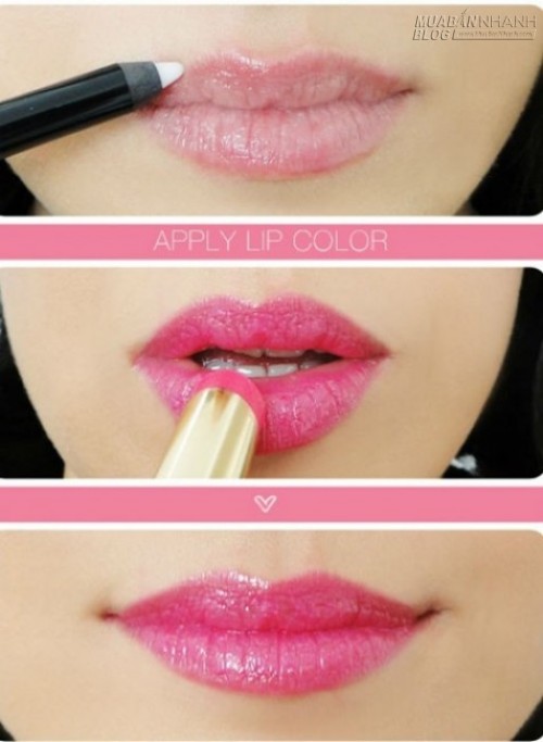 6. Tô son lên chuẩn màu: Bạn luôn cảm thấy khó chịu vì tô son không lên màu như ý? Vậy thì hãy thử áp dụng mẹo sau đây nhé: Trước khi tô son, bạn hãy tán 1 lớp phấn nền lên môi, sau đó tô son đè lên lớp phấn nền và bây giờ chiêm ngưỡng thành quả nào.