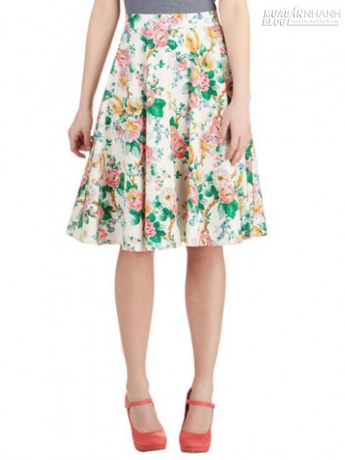 Kiểu chân váy xòe chữ A họa tiết hoa duyên dáng cũng là sự lựa chọn cho bạn gái trẻ trung, nữ tính. Nếu bạn sở hữu vóc dáng chưa cân đối thì kiểu chân váy này giúp giúp bạn cân bằng vóc dáng một cách hiệu quả, giúp vòng 3 của bạn đầy đặn hơn.
