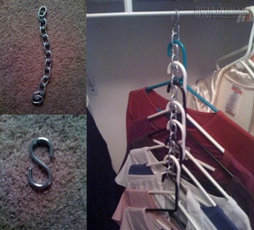 5. Tiết kiệm chỗ treo quần áo bằng các khoen lon nước ngọt, móc xích hoặc móc chữ S