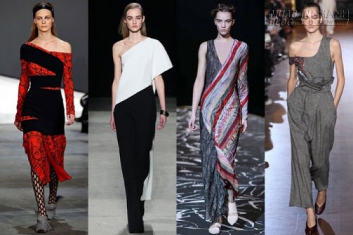 Lệch vai có xu hướng ngày càng táo bạo, xuất hiện ồ ạt ở tuần Thu Đông năm nay. Không chỉ dừng lại ở váy lệch, các nhà thiết kế còn cho ra đời những mẫu áo sơ mi bất đối xứng, jumpsuit cắt lệch một ống tay...