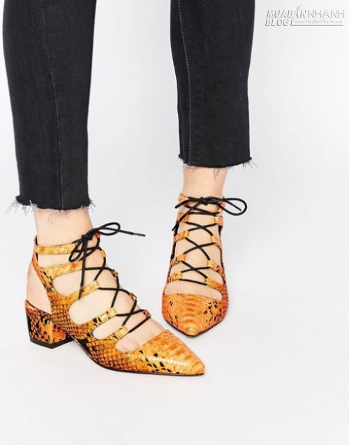 Phiên bản đế vuông của đôi giày hot gần như nhất những ngày cuối hè vừa qua, flat lace up họa tiết da trăn cam nâu ấn tượng sẽ làm quý cô hài lòng với dáng vẻ thời thượng và hết sức tinh tế của nó. Giá của đôi ASOS này là 63$, tương đương 1.350.000 VNĐ.