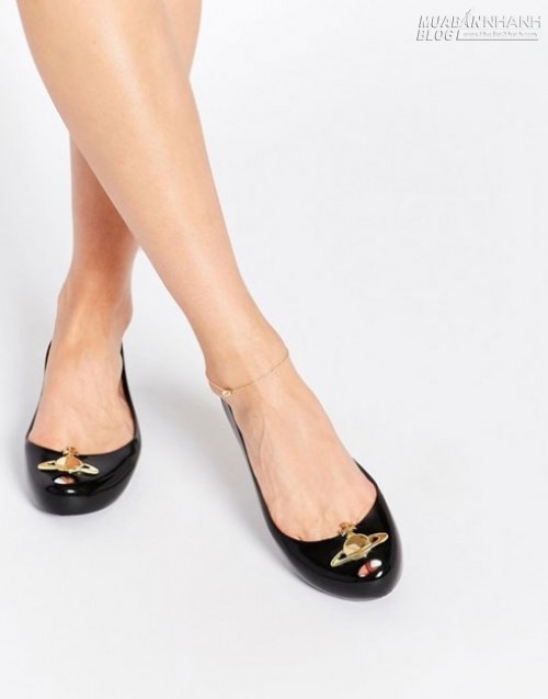 Nếu bạn đã từng mê mẩn dòng giày bệt trong thiết kế open one toe thì bạn không nên bỏ qua đôi giày đen dáng ballerina của Viviene Westwood này. Chất nhựa dẻo mềm mại ôm sát vào chân lại là chất liệu tuyệt vời để đi mưa, bạn sẽ thích thú khi đi với bất cứ trang phục nào. Váy đen suông là món đồ khuyên dùng khi đi cùng đôi giày xinh xắn này. Giá của nó là 176$, tương đương 3.780.00 VNĐ.