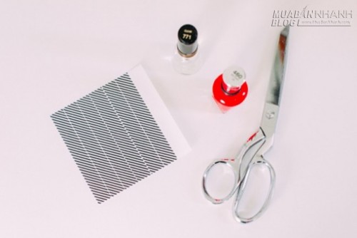 Đầu tiên cần chuẩn bị những vật dụng cần thiết, gồm 1 lọ sơn màu đỏ, 1 lọ sơn bóng, cuộn băng keo bản rộng và 1 cây kéo.