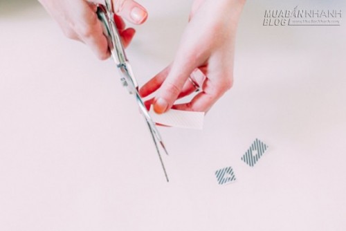 Phết đều một lớp sơn bóng lên toàn bộ móng tay. Trong thời gian chờ sơn khô, bạn nên cắt 1 đoạn băng keo rồi gấp đôi. Dùng kéo cắt phần gấp đôi để tạo thành hình trái tim như ảnh minh họa.