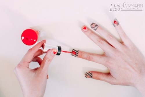 Để vẽ nail hình nửa trái tim, bạn cần chuẩn bị 1 lọ sơn móng màu đỏ, 1 lọ sơn bóng. Đầu tiên dùng sơn bóng phủ tất cả các móng. Đợi sơn bóng khô, sau đó lấy cọ tạo hình nửa trái tim ở góc ngoài cùng của móng. Phết thêm 1 lớp sơn đỏ ở phần còn lại để tạo hình nửa trái tim hoàn chỉnh.
