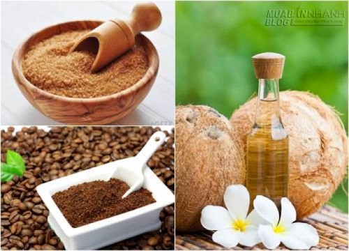 + Cho 2 thìa cà phê + 2 thìa đường nâu + 2 thìa cà phê dầu dừa vào chén, sau đó trộn đều