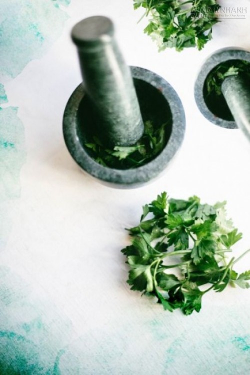 Hãy lấy một nắm lá rau mùi tươi và giã nát. Lấy phần rau đã bị giã đắp lên vùng da bị bầm tím, rồi dùng màng bọc thực phẩm quấn chặt lại. Rau mùi rất giàu vitami K, là một chất chống tụ máu tự nhiên, giúp vết thương bớt độ thâm tím. Bạn cũng có thể lấy 1 nắm lá rau mùi giã với 2 thìa nước rồi cho hỗn hợp vào khay đá. Khi hỗn hợp đông lại thành đá thì xoa các viên đá nước rau mùi lên vùng da bị thâm, da bạn sẽ vừa giảm sưng, lại bớt thâm, da sẽ sáng hơn và đều màu hơn. Hãy thực hiện liên tục mỗi ngày, bạn sẽ sớm có đôi chân nuột nà lành lặn như trước.