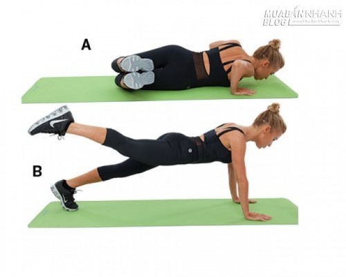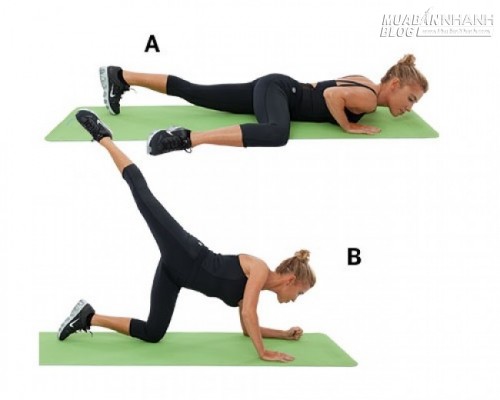 Xoay đầu gối về chính giữa, đùi ở trên sàn và đôi bàn chân hướng lên, chân trái hạ xuống. Nâng toàn thân đồng thời duỗi chân phải ra sau và đá lên trên (Hình B). Rồi trở về vị trí ban đầu (Hình A). Thực hiện trong 30 giây.