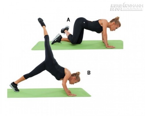 Cánh tay trái và bàn tay phải đặt trên sàn. Nhấc bàn chân ra khỏi sàn sau đó xoay cẳng chân sang bên phải (Hình A). Đưa chân về vị trí chính giữa, sau đó nâng chân phải lên (Hình B). Trở về vị trí “A” và lặp lại 30 lần.