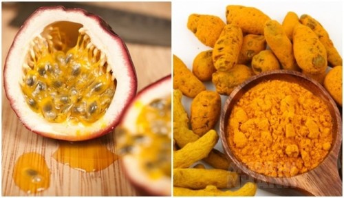 – Lấy hết phần thịt của 1 quả chanh dây rồi trộn đều với 1 thìa bột nghệ, để tạo nên hỗn hợp đặc quánh mịn.