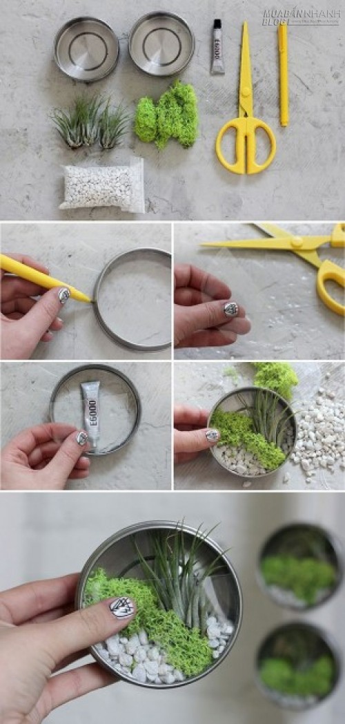Với kiểu trồng xương rồng này, bạn có thể tận dụng các thể loại đồ hộp, chỉ cần cọ sạch phần nhãn và làm thêm một phần nắp đậy trong suốt nữa là có thể đem trang trí được rồi. Kiểu hộp thiếc này thích hợp để làm thành 1 dây treo trang trí vườn, hoặc trang trí góc phòng.