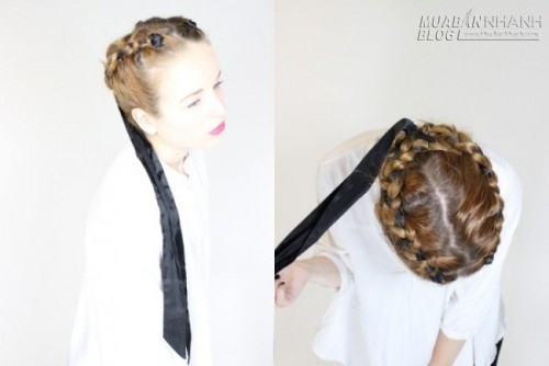 Đây là một kiểu tóc theo phong cách Pháp hơi khó làm, tuy nhiên lại đem về cho bạn một diện mạo cực kỳ lạ nhé. Đúng là chúng ta đã đề cập ở trên rằng với một mái đầu bob, việc tết tóc là không thể. Tuy nhiên với kiểu tóc này, bạn vẫn có thể thực hiện được việc thắt bím một cách bất ngờ đấy. Đầu tiên bạn chia tóc làm 2 nửa. Với mỗi nữa tóc, bạn tết 3 như vẫn thực hiện bình thường, tuy nhiên hãy sử dụng 1 sợi ruy băng làm 1 trong 3 lọn tóc để tết nhé. Khi tết, bạn nhớ tết những mắt tóc ra phía ngoài và cố gắng căn chỉnh đường tết sao cho thật cao để vừa đủ độ dài với mái tóc của mình nhé (nếu bạn tết thấp, cam đoan rằng tóc sẽ bị rơi ra rất nhiều và xấu). Sau khi đã tết cả 2 phần tóc vòng ra phía sau đầu, bạn thắt nút lại và thả sợi ruy băng dài thõng xuống tự nhiên. Trông bạn như đang đôi một chiếc vương miện độc lạ mà chẳng nàng công chúa nào có được vậy!