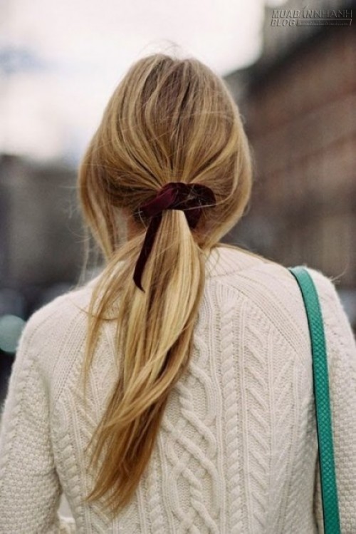 Những ngày thời tiết se lạnh, sẽ thật hoàn hảo nếu bạn ra ngoài với chiếc áo len ấm áp và thực hiện kiểu tóc đuôi ngựa buộc thấp với nơ nhung. Kiểu tóc này tuy đơn giản nhưng nó lại mang đến cho bạn vẻ đẹp bất ngờ. Hãy lựa chọn màu sắc của nơ phù hợp với set đồ của bạn để tạo nên sự hài hòa nhé!