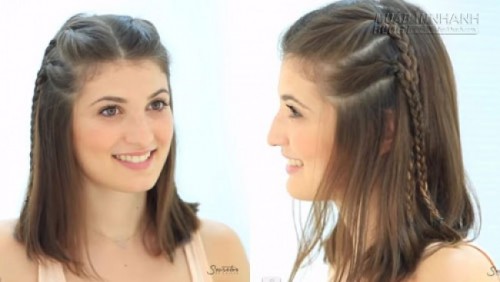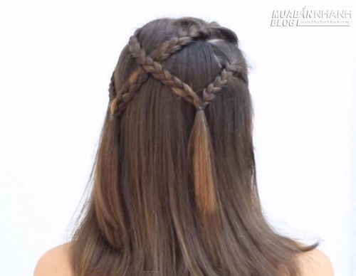 Tết hai lọn tóc ở hai bên như kiểu 1 rồi ghim chúng lại với nhau ra đằng sau sao cho các lọn tóc tạo thành hình zíc zắc đẹp mắt.