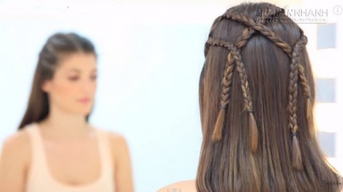 - Cũng buộc các lọn tóc tết lại nhưng bạn buộc cao một chút rồi thả phần đuôi tóc ra