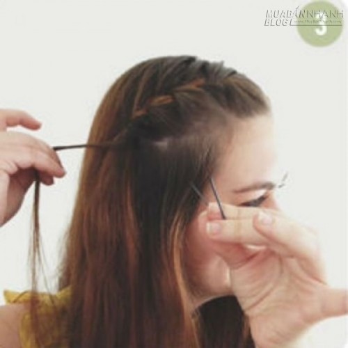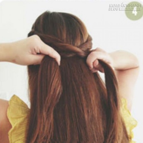 Bước 4: Bạn làm tương tự với bên tóc còn lại, sau đó, vòng chéo hai lọn tóc vào nhau để tạo thành kiểu tóc buộc nửa đầu duyên dáng.