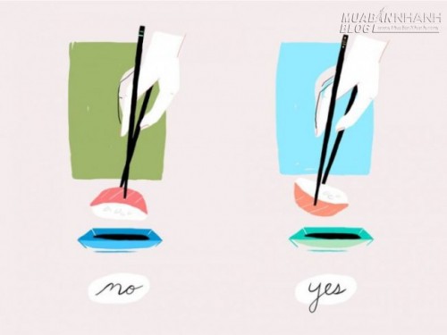 Để tránh làm rơi cơm từ sushi vào nước chấm, bạn phải gắp ngược miếng sushi và nhúng phần cá vào nước chấm. Chỉ nên chấm sushi với một ít nước tương. Sushi đã được cuộn nhỏ theo cỡ của một miếng nên khi ăn, bạn cho cả miếng sushi vào miệng 1 lần. Sẽ là xúc phạm người đầu bếp nếu bạn tách riêng phần cá và cơm ra để chấm.