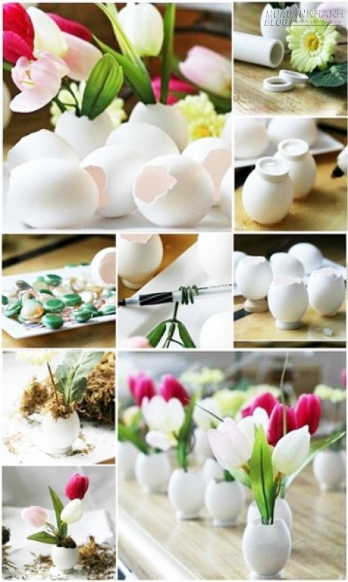 Mỗi khi chế biến món trứng, bạn hãy khéo léo đập để giữ được vỏ trứng nguyên vẹn, sau đó rửa sạch vàgắn chun tròn hoặc nắp chai vào đáy trứng làm đế. Nhồi mùn cưa vào trong vỏ trứng sao đó cắm hoa lên.