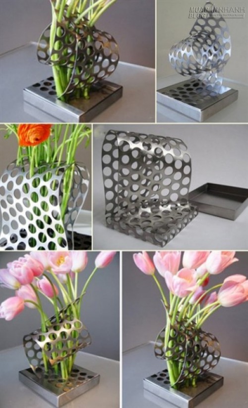 Để tăng mức độ nghệ thuật lên, bạn có thể dùng miếng thép lỗ thành hình tròn hoặc hình xoắn, uốn gập và cố định một đầu miếng thép vào khay nhỏ chứa nước.