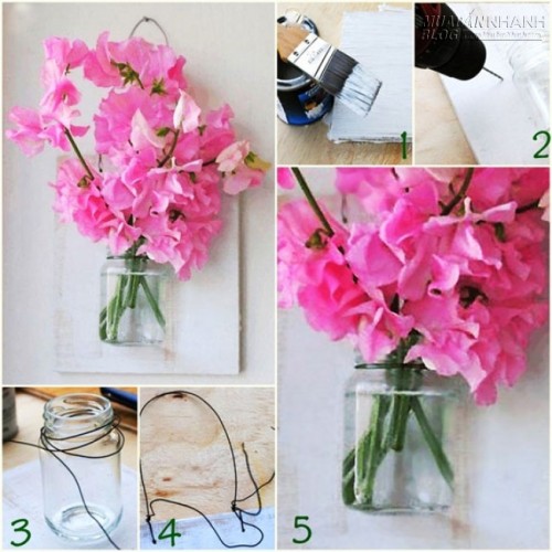 Bạn cần chuẩn bị một chiếc bảng gỗ, một chiếc lọ thủy tinh và một đoạn dây thép nhỏ. Đầu tiên, bạn sơn màu lên chiếc bảng, sau đó khoan hai lỗ nhỏ cách nhau một đoạn bằng đường kính miệng lọ. Dùng dây thép nhỏ buộc xung quanh miệng lọ rồi xuyên qua bảng, thắt chụm dây lên trên để tạo thành móc treo. Cách treo này sẽ giúp bạn khắc phục được những chỗ tường trống hoặc ảm đạm trở nên sinh động hơn