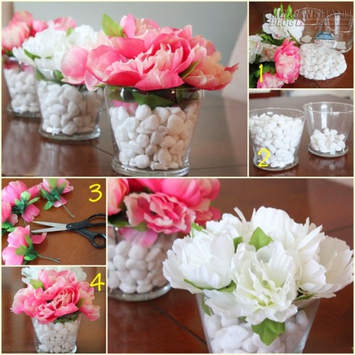 Một chiếc cốc nhựa miệng lớn cùng một chút sỏi trắng hoặc hạt màu để trang trí là bạn đã có thể tạo được một bình hoa mini cute.