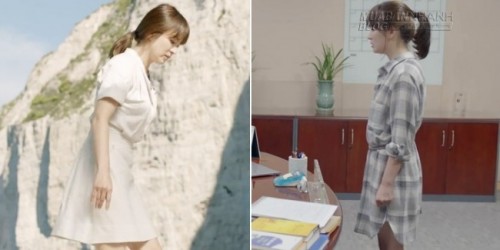 Sơ mi dáng váy kẻ đen trắng được Mo Yeon mặc trong tập 3 của bộ phim được các tín đồ thời trang bóc giá chưa đến 1 triệu đồng. Cô thường để kiểu tóc đuôi ngựa khi diện mẫu váy này. Kiểu áo màu nude có độ dài tới mắt cá chân cũng khiến người đẹp yêu thích.