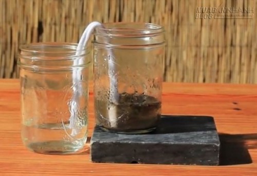 Trong một số trường hợp bạn không thể tìm được nguồn nước sạch để uống thì đây có thể sẽ là một giải pháp cứu mạng của bạn. Hãy cho nước bẩn vào một cái bình và để cao hơn bình đựng nước sạch. Dùng một miếng khắn giấy cuộn lại và để 2 đầu vào 2 bình sao cho chúng chạm đáy. Nước sẽ ngấm vào khăn giấy và chảy sang bên bình kia, để lại gặn bẩn