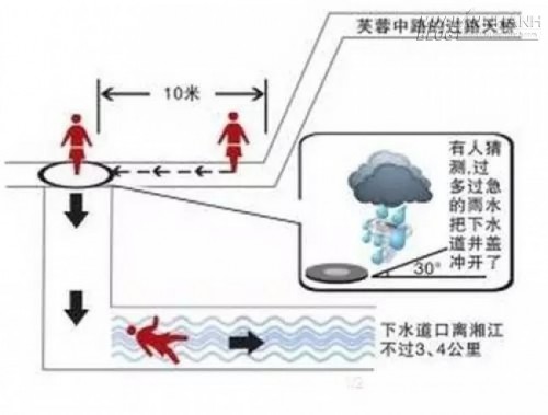Năm 2013, trong một trận mưa lớn ở Trường Giang, một cô gái lội nước qua đường đã bị cuốn xuống cống thoát nước.