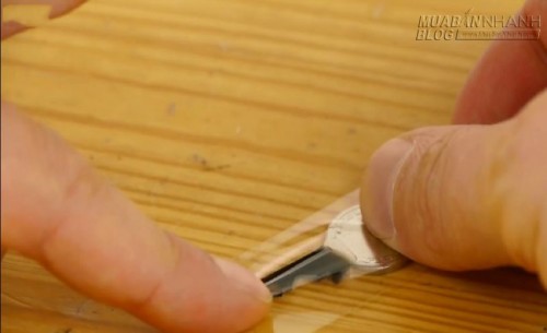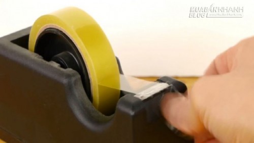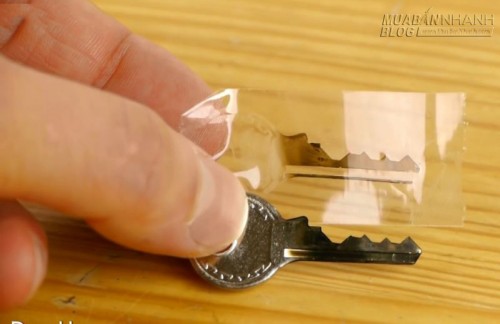 3. Bạn cắt một đoạn keo trong dài hơn chiều dài chìa khóa một chút, rồi nhẹ nhàng dán đoạn keo ấy vào mặt đầy nhọ đen của chìa khóa. Chú ý vuốt đoạn keo dính thật đều, thật thẳng vào chìa khóa.
