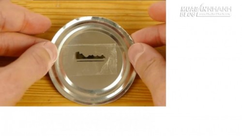 6. Bạn để nắp hộp ngay ngắn lên bàn, rồi lấy đoạn keo in mẫu chìa khóa lúc nãy nhẹ nhàng dán lên bề mặt nắp hộp.