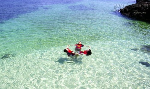 Du khách thỏa sức chơi đùa dưới làn nước biển trong xanh ở cù lao Bờ Bãi. Ảnh: Ngong Hankang
