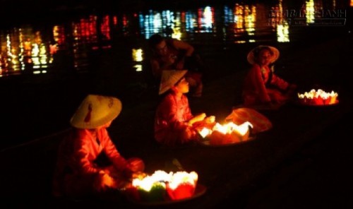 Những cô bé, cậu bé bán hoa đăng cho khách du lịch thả xuống sông Thu Bồn. |