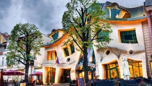 Ngôi nhà Krzywy Domek với kiến trúc độc đáo đã thu hút hàng ngàn du khách mỗi năm đến chiêm ngưỡng địa danh đẹp như trong truyện cổ tích. Ngôi nhà rộng 4.000m2, được xây dựng vào năm 2004. Để làm nên hình dạng uốn éo dị thường, tất cả các bức tường, mái ngói, ban công, cửa sổ của ngôi nhà đều cong. Bạn sẽ có cảm giác ngôi nhà đang bị biến dạng hoặc bị ảo ảnh của ngôi nhà đánh lừa đôi mắt của mình.