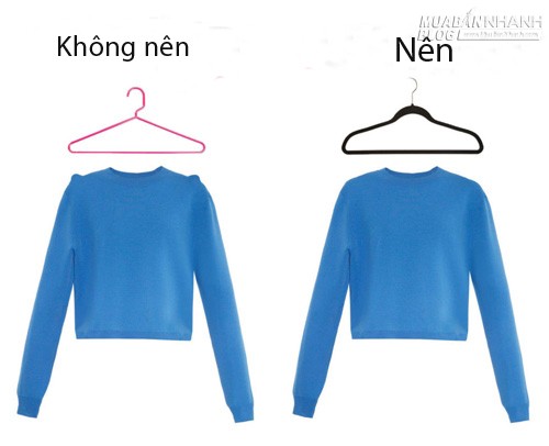 Rất nhiều người bất cẩn trong khâu phơi áo len. Họ thường chọn loại móc áo nhựa, vuông vai để phơi áo len, áo thun khiến vai áo bị nhọn rất xấu xí khi khô. Để hạn chế tính trạng này bạn nên vắt ngang áo trên móc hoặc chọn loại móc tròn vai.